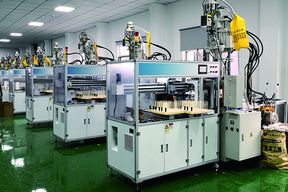立式鎖模,立式射出轉(zhuǎn)盤(pán)2站式或者3站式,可雙色或雙材料一體成型。